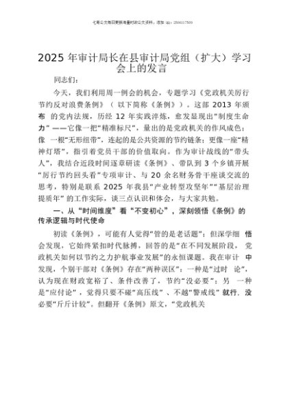 【七哥公文】2025年:2025年审计局长在县审计局党组(扩大)学习会上的发言+更多免费公文+VX:QiGeGongWen2024