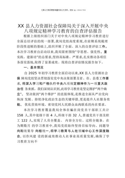 【七哥公文】2025年:XX县人力资源社会保障局关于深入开展中央八项规定精神学习教育的自查评估报告+更多免费公文+VX:QiGeGongWen2024