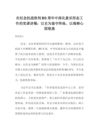 【七哥公文】2025年:在纪念抗战胜利80周年中深化意识形态工作的党课讲稿:以史为鉴守阵地、以魂铸心固根基+更多免费公文+VX:QiGeGongWen2024