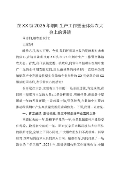 【七哥公文】2025年:在XX镇2025年烟叶生产工作暨全体烟农大会上的讲话+更多免费公文+VX:QiGeGongWen2024