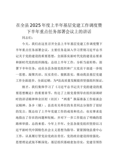 【七哥公文】2025年:在全县2025年度上半年基层党建工作调度暨下半年重点任务部署会议上的讲话+更多免费公文+VX:QiGeGongWen2024