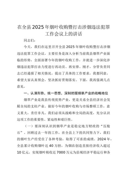 【七哥公文】2025年:在全县2025年烟叶收购暨打击涉烟违法犯罪工作会议上的讲话+更多免费公文+VX:QiGeGongWen2024