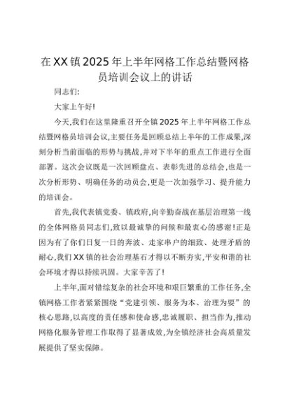 【七哥公文】2025年:在XX镇2025年上半年网格工作总结暨网格员培训会议上的讲话+更多免费公文+VX:QiGeGongWen2024