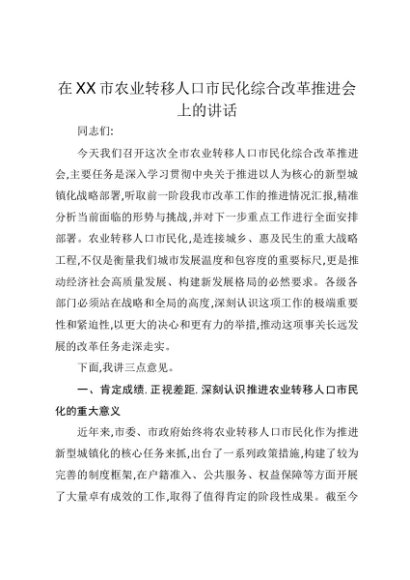 【七哥公文】2025年:在XX市农业转移人口市民化综合改革推进会上的讲话+更多免费公文+VX:QiGeGongWen2024