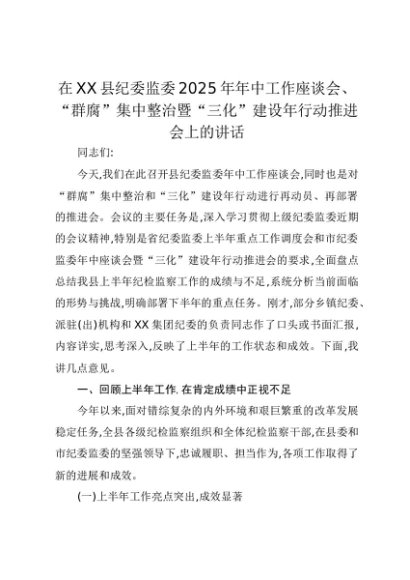 【七哥公文】2025年:在XX县纪委监委2025年年中工作座谈会、“群腐”集中整治暨“三化”建设年行动推进会上的讲话+更多免费公文+VX:QiGeGongWen2024