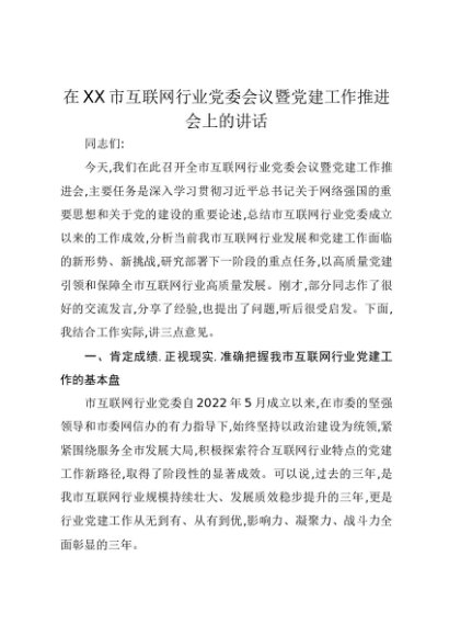【七哥公文】2025年:在XX市互联网行业党委会议暨党建工作推进会上的讲话+更多免费公文+VX:QiGeGongWen2024