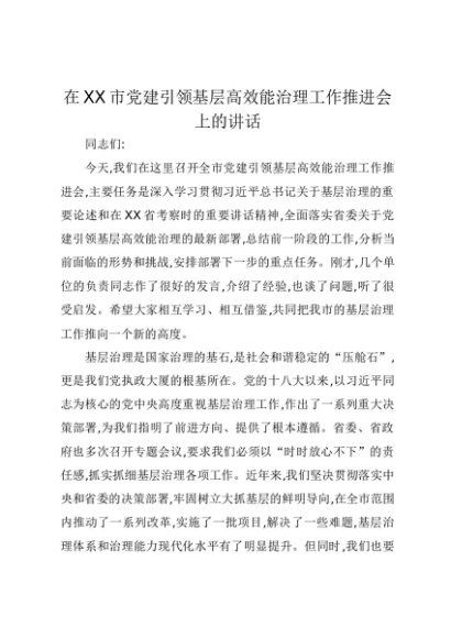 【七哥公文】2025年:在XX市党建引领基层高效能治理工作推进会上的讲话+更多免费公文+VX:QiGeGongWen2024