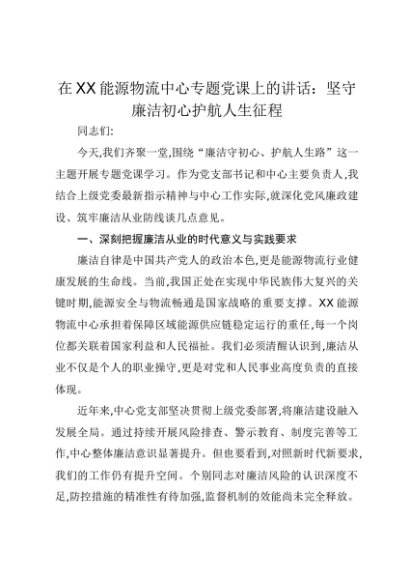 【七哥公文】2025年:在XX能源物流中心专题党课上的讲话:坚守廉洁初心护航人生征程+更多免费公文+VX:QiGeGongWen2024