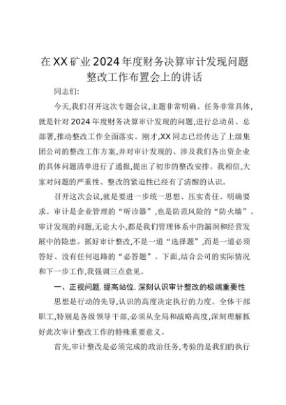 【七哥公文】2025年:在XX矿业2024年度财务决算审计发现问题整改工作布置会上的讲话+更多免费公文+VX:QiGeGongWen2024