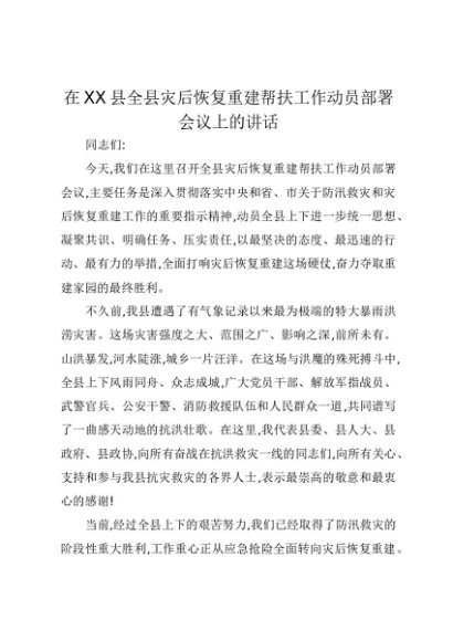 【七哥公文】2025年:在XX县全县灾后恢复重建帮扶工作动员部署会议上的讲话+更多免费公文+VX:QiGeGongWen2024