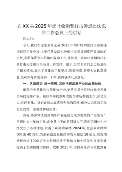【七哥公文】2025年:在XX县2025年烟叶收购暨打击涉烟违法犯罪工作会议上的讲话+更多免费公文+VX:QiGeGongWen2024