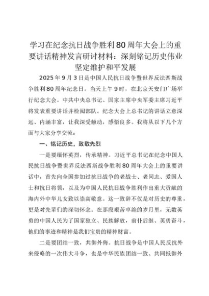 【七哥公文】2025年:学习在纪念抗日战争胜利80周年大会上的重要讲话精神发言研讨材料:深刻铭记历史伟业 坚定维护和平发展+更多免费公文+VX:QiGeGongWen2024