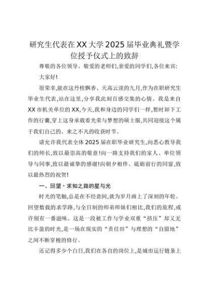 【七哥公文】2025年:研究生代表在XX大学2025届毕业典礼暨学位授予仪式上的致辞+更多免费公文+VX:QiGeGongWen2024