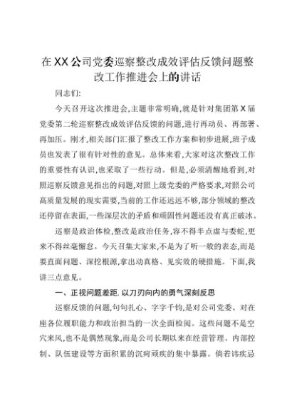 【七哥公文】2025年:在XX公司党委巡察整改成效评估反馈问题整改工作推进会上的讲话+更多免费公文+VX:QiGeGongWen2024