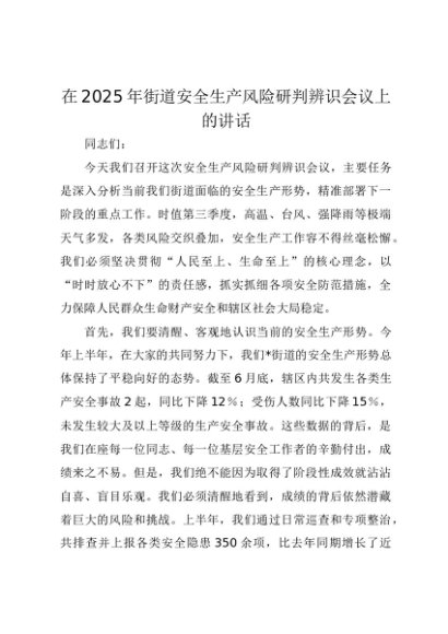 【七哥公文】2025年:在2025年街道安全生产风险研判辨识会议上的讲话+更多免费公文+VX:QiGeGongWen2024