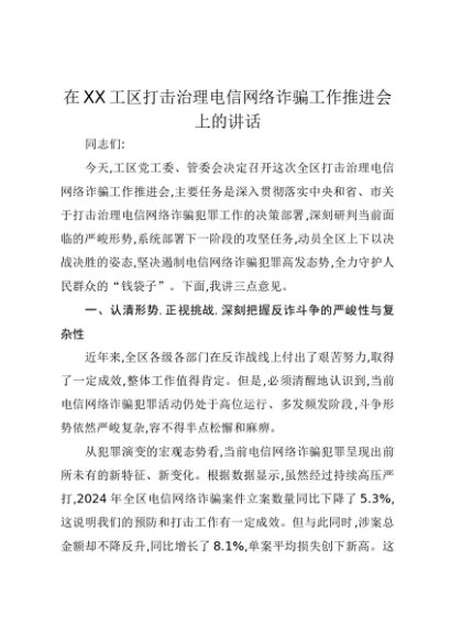 【七哥公文】2025年:在XX工区打击治理电信网络诈骗工作推进会上的讲话+更多免费公文+VX:QiGeGongWen2024