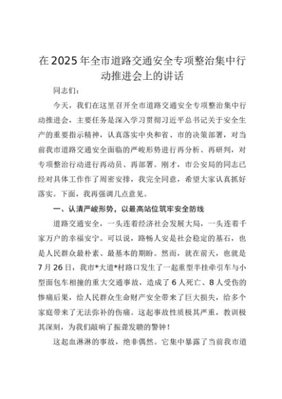 【七哥公文】2025年:在2025年全市道路交通安全专项整治集中行动推进会上的讲话+更多免费公文+VX:QiGeGongWen2024