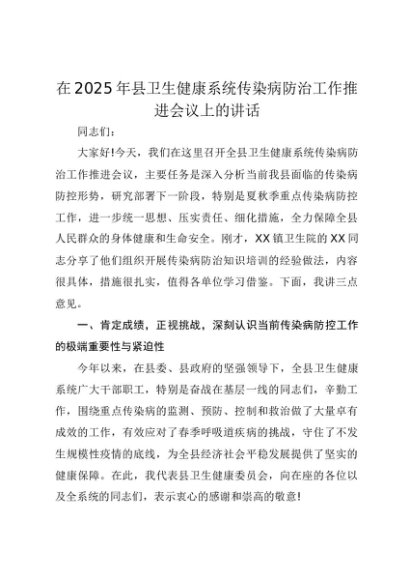 【七哥公文】2025年:在2025年县卫生健康系统传染病防治工作推进会议上的讲话+更多免费公文+VX:QiGeGongWen2024