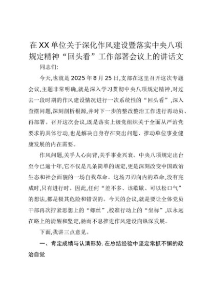 【七哥公文】2025年:在XX单位关于深化作风建设暨落实中央八项规定精神“回头看”工作部署会议上的讲话+更多免费公文+VX:QiGeGongWen2024