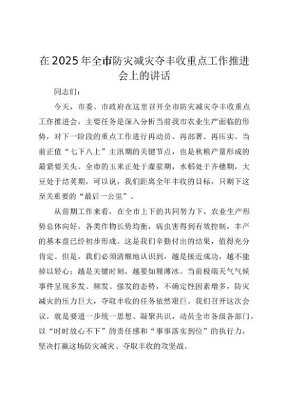 【七哥公文】2025年:在2025年全市防灾减灾夺丰收重点工作推进会上的讲话+更多免费公文+VX:QiGeGongWen2024