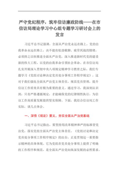 【七哥公文】2025年:严守党纪程序,筑牢信访廉政防线——在市信访局理论学习中心组专题学习研讨会上的发言+更多免费公文+VX:QiGeGongWen2024