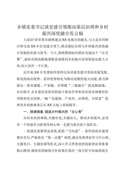 【七哥公文】2025年:乡镇党委书记谈党建引领推动基层治理和乡村振兴深度融合发言稿+更多免费公文+VX:QiGeGongWen2024