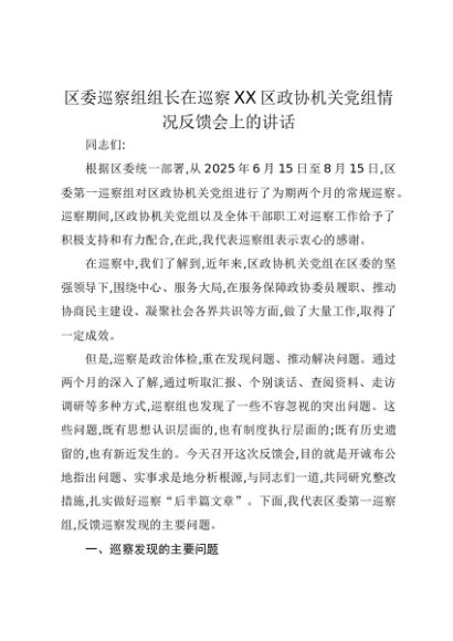 【七哥公文】2025年:区委巡察组组长在巡察XX区政协机关党组情况反馈会上的讲话+更多免费公文+VX:QiGeGongWen2024