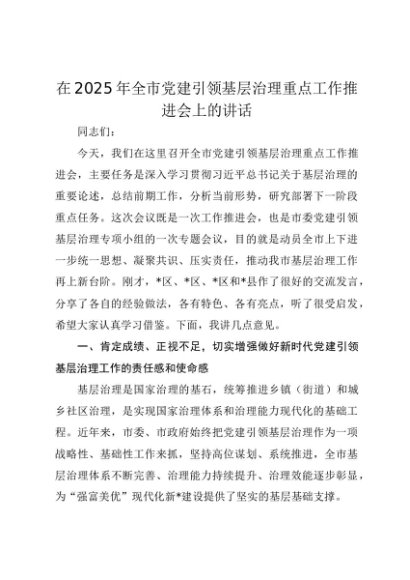 【七哥公文】2025年:在2025年全市党建引领基层治理重点工作推进会上的讲话+更多免费公文+VX:QiGeGongWen2024