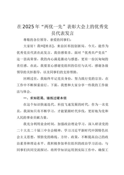 【七哥公文】2025年:在2025年“两优一先”表彰大会上的优秀党员代表发言+更多免费公文+VX:QiGeGongWen2024