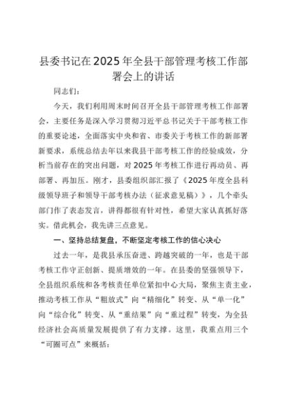 【七哥公文】2025年:县委书记在2025年全县干部管理考核工作部署会上的讲话+更多免费公文+VX:QiGeGongWen2024