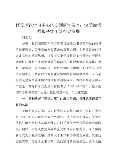 【七哥公文】2025年:区委理论学习中心组专题研讨发言:深学细悟强根基 实干笃行促发展+更多免费公文+VX:QiGeGongWen2024