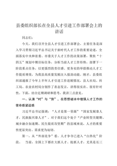 / 【七哥公文】2025年:县委组织部长在全县人才引进工作部署会上的讲话+更多免费公文+VX:QiGeGongWen2024