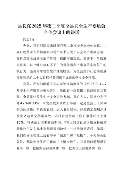 【七哥公文】2025年:县长在2025年第二季度全县安全生产委员会全体会议上的讲话+更多免费公文+VX:QiGeGongWen2024