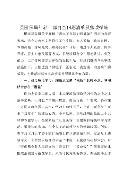 【七哥公文】2025年:县医保局年轻干部自查问题清单及整改措施+更多免费公文+VX:QiGeGongWen2024