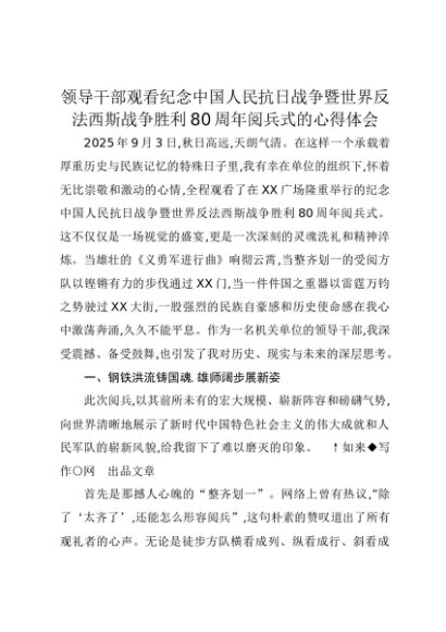 【七哥公文】2025年:领导干部观看纪念中国人民抗日战争暨世界反法西斯战争胜利80周年阅兵式的心得体会+更多免费公文+VX:QiGeGongWen2024