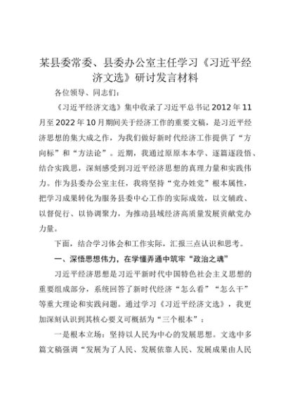 【七哥公文】2025年:某县委常委、县委办公室主任学习《习近平经济文选》研讨发言材料+更多免费公文+VX:QiGeGongWen2024