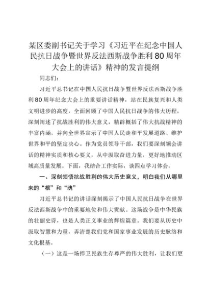 【七哥公文】2025年:某区委副书记关于学习《习近平在纪念中国人民抗日战争暨世界反法西斯战争胜利80周年大会上的讲话》精神的发言提纲+更多免费公文+VX:QiGeGongWen2024