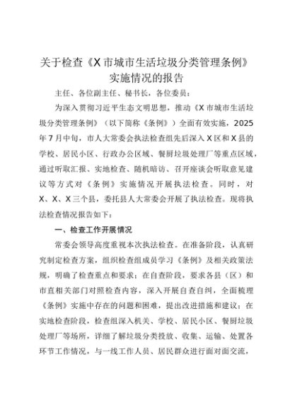 【七哥公文】2025年:关于检查《X市城市生活垃圾分类管理条例》实施情况的报告+更多免费公文+VX:QiGeGongWen2024