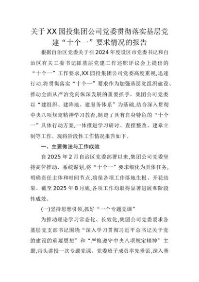 【七哥公文】2025年:关于XX园投集团公司党委贯彻落实基层党建“十个一”要求情况的报告+更多免费公文+VX:QiGeGongWen2024