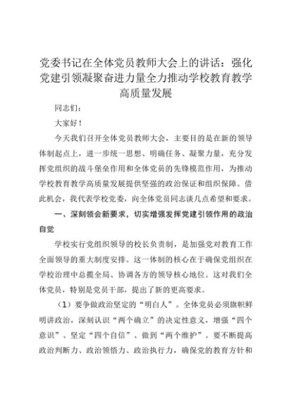 【七哥公文】2025年:党委书记在全体党员教师大会上的讲话:强化党建引领凝聚奋进力量全力推动学校教育教学高质量发展+更多免费公文+VX:QiGeGongWen2024