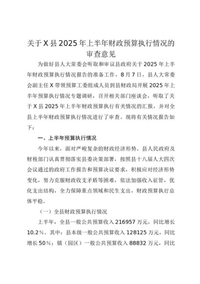 【七哥公文】2025年:关于X县2025年上半年财政预算执行情况的审查意见+更多免费公文+VX:QiGeGongWen2024