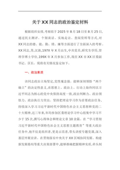 【七哥公文】2025年:关于XX同志的政治鉴定材料+更多免费公文+VX:QiGeGongWen2024