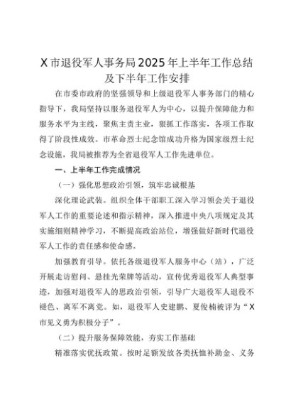 【七哥公文】2025年:X市退役军人事务局2025年上半年工作总结及下半年工作安排+更多免费公文+VX:QiGeGongWen2024