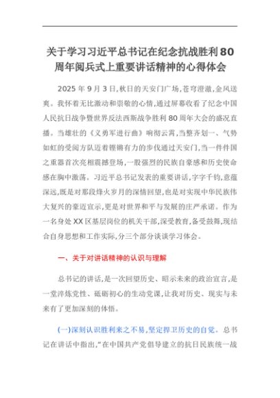 【七哥公文】2025年:关于学习习近平总书记在纪念抗战胜利80周年阅兵式上重要讲话精神的心得体会+更多免费公文+VX:QiGeGongWen2024