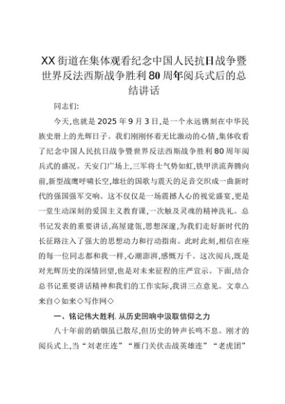 【七哥公文】2025年:XX街道在集体观看纪念中国人民抗日战争暨世界反法西斯战争胜利80周年阅兵式后的总结讲话+更多免费公文+VX:QiGeGongWen2024