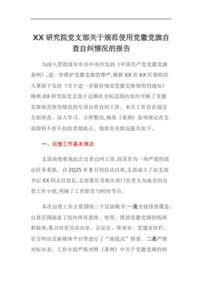 【七哥公文】2025年:XX研究院党支部关于规范使用党徽党旗自查自纠情况的报告+更多免费公文+VX:QiGeGongWen2024