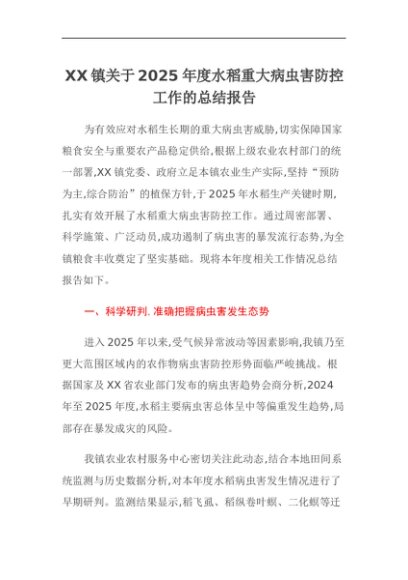 【七哥公文】2025年:XX镇关于2025年度水稻重大病虫害防控工作的总结报告+更多免费公文+VX:QiGeGongWen2024