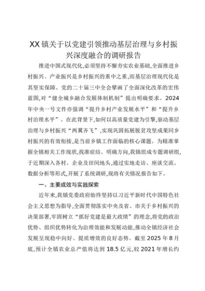 【七哥公文】2025年:XX镇关于以党建引领推动基层治理与乡村振兴深度融合的调研报告+更多免费公文+VX:QiGeGongWen2024