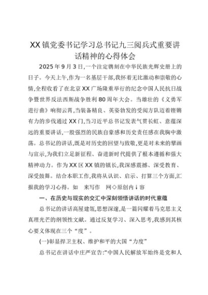 【七哥公文】2025年:XX镇党委书记学习总书记九三阅兵式重要讲话精神的心得体会+更多免费公文+VX:QiGeGongWen2024