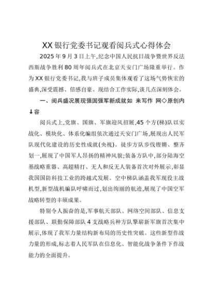 / 【七哥公文】2025年:XX银行党委书记观看阅兵式心得体会+更多免费公文+VX:QiGeGongWen2024